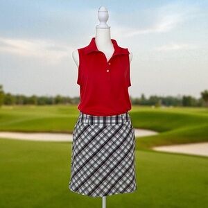 Ace your activewear game with this Tehama by Nancy Haley plaid skort in a crisp white, red, and black palette. Designed for both golf and tennis, this size 6 skort combines classic style with performance-ready comfort. The bold plaid pattern adds a touch of sporty elegance, while the built-in shorts offer coverage and confidence on the move.