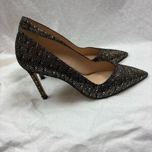 Elegant pointed heels with black lace and gold accents. Perfect for formal occasions.