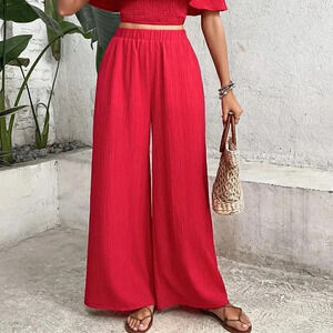 Red Boho Womens Off Shoulder Ruffle Trim Top & Wide Leg Pants