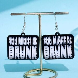 Bold black and white statement earrings with 'You Might Be Drunk' text. Perfect for a fun night out.