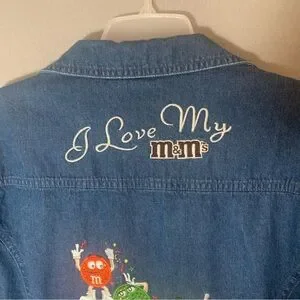 This is a vintage M&M's denim jacket with embroidered characters and the text "I Love My M&M's".