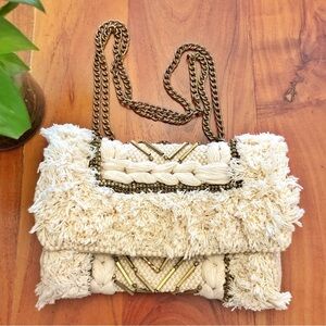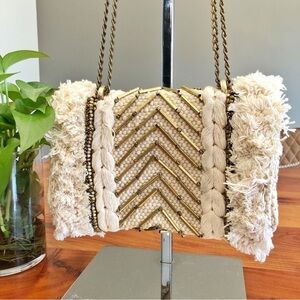 ZARA Unique Boho Beaded Cream Golden Tone Chain &Hardware Crossbody Shoulder Bag