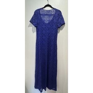 Great pre-owned condition. No flaws. Dress is lined, lower part of dress is sheer. Color is a blue purple color.