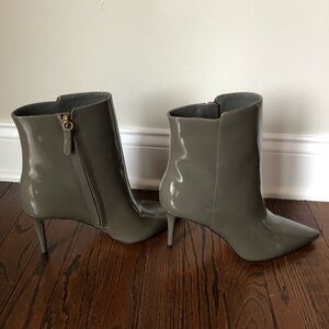 Details: Beautiful J. Crew Stevie Pointed Toe Ankle Boots in Gray Shiny Patented Leather. Pointed toe. Approx 3.75” heel. Ankle height. Side zipper with pull for easy on/off.