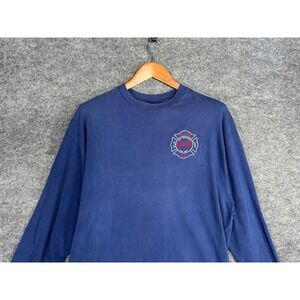 This Sf Fire shirt is in good pre owned condition with average wear. It has some marks and wear. Embrace a piece of San Francisco's heroic history with this classic long-sleeve t-shirt. Its rich navy blue hue is the perfect backdrop for the striking embroidered San Francisco Fire Department Engine 43 logo, showcasing the iconic Golden Gate Bridge and the badge of honor. Crafted from durable, comfortable cotton, this pre-shrunk tee promises a consistent fit wash after wash, making it an ideal companion for everyday adventures or a thoughtful gift for anyone who admires the bravery of firefighters. Perfect for casual outings, supporting local heroes, or commemorating a visit to the city by the bay.