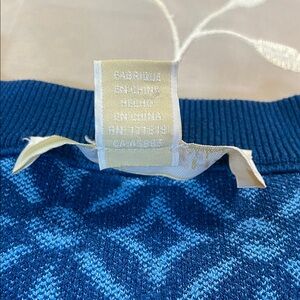 Stylish blue sweater with intricate pattern. Short sleeves. Perfect for layering.