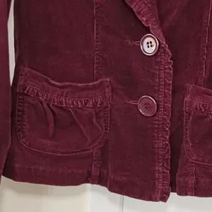 A collared maroon burgundy Sashimi corduroy Blazer Jacket from early 2000s. The cute accents like tiny ruffle edging, pockets, and 2 oversized buttons make it extra cute.