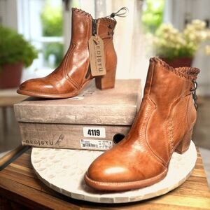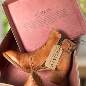 BedStü Bia, BedStü Bia bootie, BedStü ankle boot, women’s leather ankle boot, tan leather bootie women, BedStü boots USA size 11, handmade Mexican leather boot, stacked heel ankle boot, BedStü Bia tan rustic