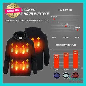 Style: Unisex heated hoodie with full zipper and adjustable drawstring hood