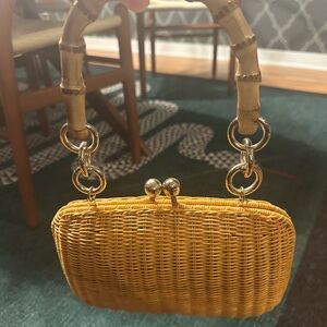 Fabric is a woven wicker with a lined interior and kiss lock closure. Features bamboo handle with gold tone hardware. Small stain on left side in internal lining.