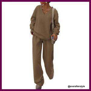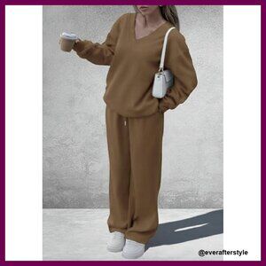 V Neck Sweatshirt Wide Leg Pants Set Cozy Knit Casual Winter Outfit