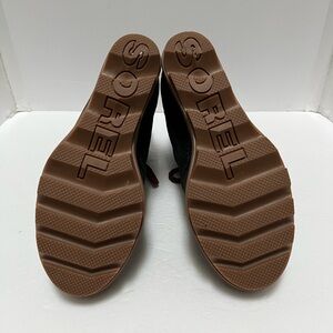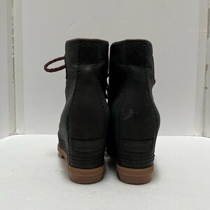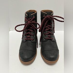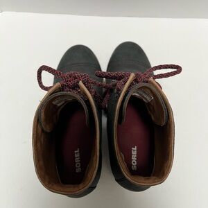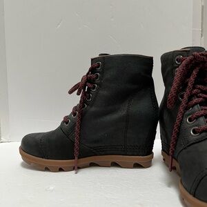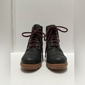Sorel combat boots with sturdy black leather. Features striking red laces and brown soles. Ideal for rugged style.