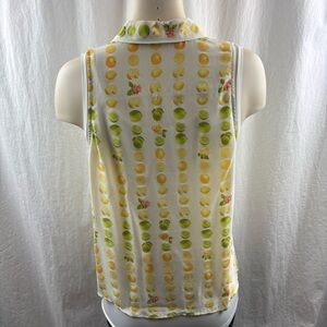 Vibrant sleeveless blouse with citrus pattern with pointed collar. Bottom up placard.Perfect for sunny days.