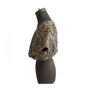Elegant White House Black Market cropped bolero-style jacket featuring intricate silver and pewter sequin embroidery on a champagne-toned base. It includes hidden hook-and-eye closures at the front, allowing it to be worn open or closed.