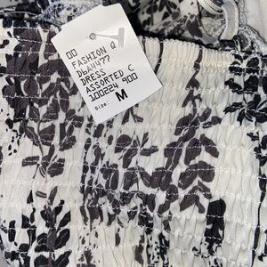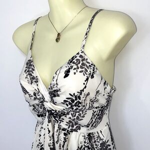 BY CAMELLIA, HERE IS A WONDERFUL MAXI DRESS FOR SUMMER. IT IS 100% POLY AND LINED FROM THE BODICE TO THE KNEES IN WHITE. THE PRINT IS WHITE WITH CHARCOAL LEAVES ADORNING IT. THIS DRESS FEATURES ADJUSTABLE SPAGHETTI STRAPS, A FITTED V NECK AND AN ELASTIC BACK PLACKET. IT FALLS TO ANKLE LENGTH AND HAS A RUFFLE HEM.NWOT SIZE MEDIUM, PLEASE NOTE THE MEASUREMENTS