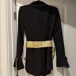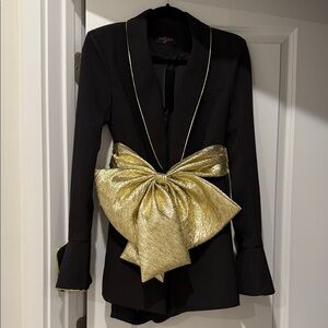 This sophisticated black jacket features a striking gold bow, perfect for making a statement. Ideal for formal occasions or adding a touch of elegance to any outfit.