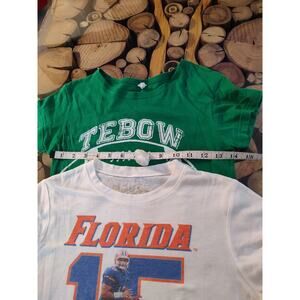 Tim Tebow UF University of Florida 15 NY Jets t-shirt bundle lot women's Small, in good pre-owned condition. No holes no stains, minor wear, stale smell. Marked as a women's size small, measurements are taken while laying flat and are approximate: (see photos)