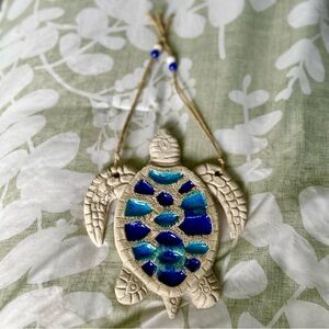 VTG Stone Blue Glass Sea Turtle Nautical Wall Hanging Decor Beaded Accent