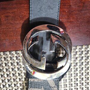 Stylish Gucci belt with a bold pattern. Features a silver logo buckle. Perfect for any outfit.