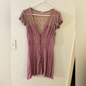 Chic dusty lavender pink dress with lace cap sleeves. Features a deep V-neck and button-front design. Ideal for stylish outings.