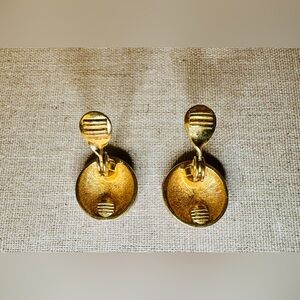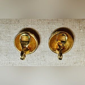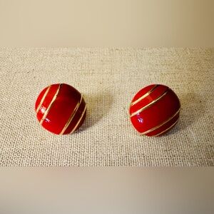 Vintage MONET red and gold-tone clip-on earrings, often described as having a domed or rounded shape with diagonal stripes. Signed for authenticity.