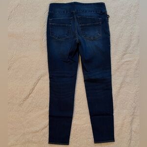 Excellent Dark wash jeans are like new no wear, tears or stains to report. Pull on wide waistband style with faux front pockets & 2 back pockets. Slight distressing throughout hip area. Approx. 10” Rise Size 12 stretch.