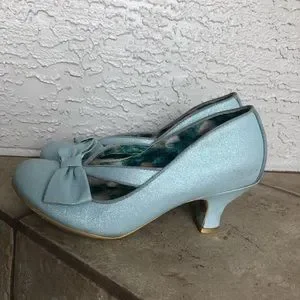 Charming light blue heels with a bow accent. Unique design by Irregular Choice. Perfect for adding a playful touch to any outfit.