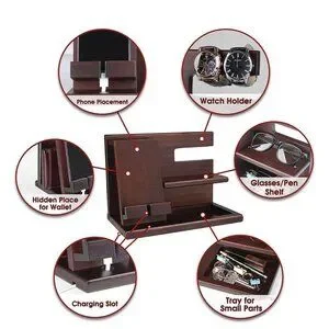 MULTIFUNCTIONAL CHARGING STATION & ORGANIZER:An exclusive house for your personal belongings, like a mobile phone charging station, key holder, wallet stand, watch organizer and glasses station. They will always be there when you need to find them.