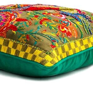 It’s easy to see why you’ll flock to this cockatiel pillow. A printed cockatiel on cotton linen is lavishly embellished with beads, embroidery, and textural stitching, finished with a border of chartreuse checks, and trimmed with cotton-velvet cording.