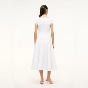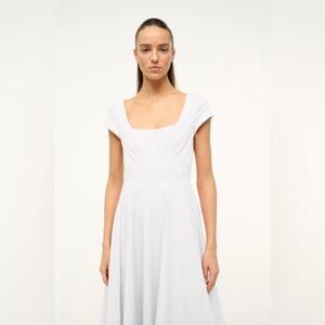This short sleeve dress is fashioned after the STAUD signature Wells Dress and features the same corset-style panel construction and a-line skirt.