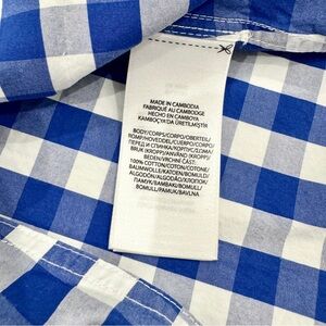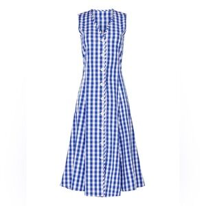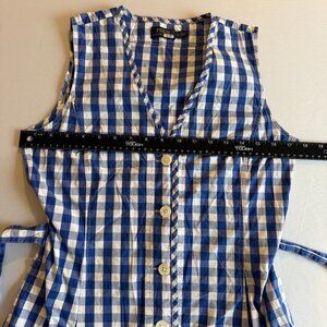 Blue plaid cotton (100% Cotton). Hourglass. Sleeveless. V-neckline. V-neck. Pockets. Self ties at back waist. 46.5" from shoulder to hemline. Imported.”