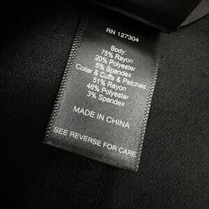Materials: Body 75% rayon, 20% polyester, 5% spandex; collar, cuffs and patches 51% rayon, 46% polyester, 3% spandex (per tag).