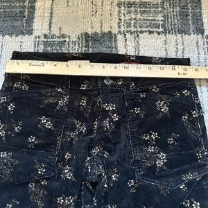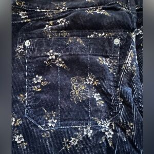 Cheeky, floral corduroy straight leg pants. Women’s Size 26. Features a flattering straight-leg silhouette with a mid-rise fit and classic button/zip closure. Perfect for dressing up with a blouse or styling casually with knits and flats. A great piece for fall, holiday, or evening wear.