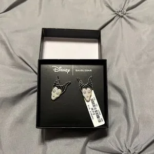 Disney BaubleBar earrings featuring Maleficent design. Striking black and white color scheme. Perfect for Disney fans.