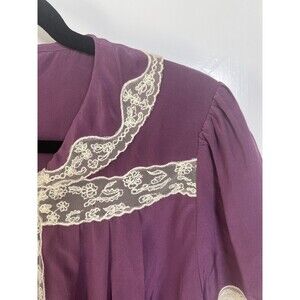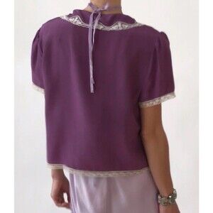 Features plum 100% silk with lace detail, pleated short sleeve, tie closure.