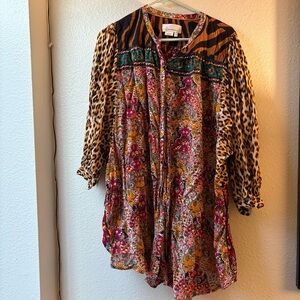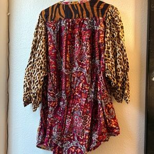 Features leopard print sleeves and colorful floral designs. Ideal for a bold fashion statement.