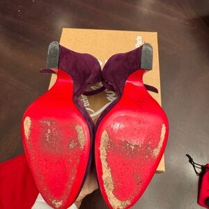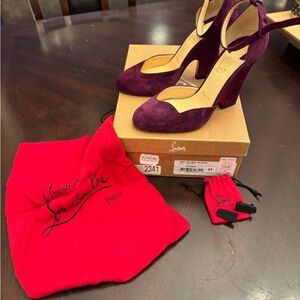 Chic deep purple suede pumps by Christian Louboutin. Features elegant design with a block heel.