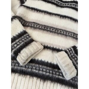 A vintage V-neck sweater crafted from an alpaca and merino wool blend. This pullover features a distinctive horizontal stripe pattern in cream, black, and grey tones. The knit showcases a textured appearance with a ribbed hem and cuffs for a classic fit. The neckline is finished with a V-shaped opening and a ribbed trim.