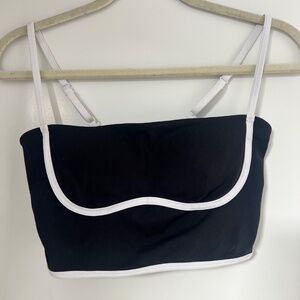 Stylish black tank top with white trim. Features thin straps and a fitted design. Perfect for yoga or casual wear. Didn’t fit