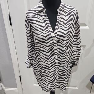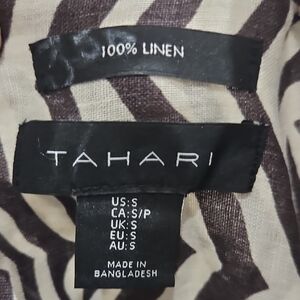 Elegant linen shirt with bold Brown and Cream pattern. Features a classic collar and button-up front. Ideal for versatile styling. 100% Linen