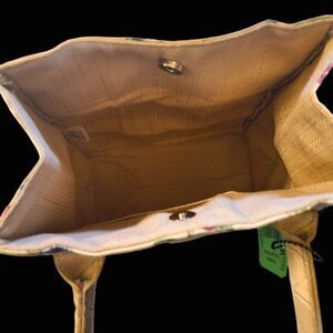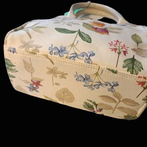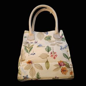 This gorgeous bag lives up to the much-loved Longaberger name -- the quality is superb and the colorful Jacobean floral is exquisite. This is a structured top handle satchel and the handles are cream leather. Any bag that is versatile is essential, and this fits the bill - it would be equally at home for a casual look with jeans, when you travel on vacation, at a business casual event or even a formal event like a wedding! It appears to be NWOT, there are no known flaws and a tag is still in the bag. No marks whatsoever on the interior lining fabric in a pastel tan and beige print pattern. Gorgeous bag!