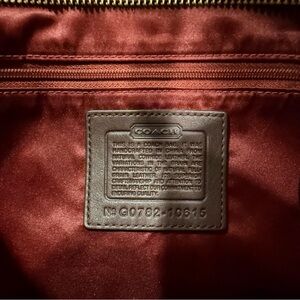 Sophisticated dark brown leather bag by Coach. Features gold-tone hardware. Ideal for versatile styling.