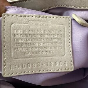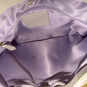 Chic Coach shoulder bag with a tan and white design. Features signature pattern and gold-tone hardware. Perfect for everyday use.