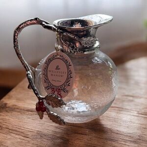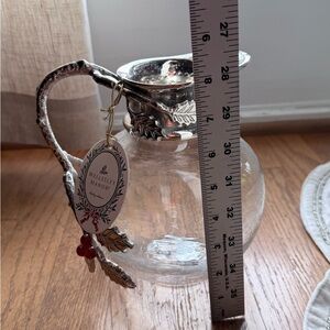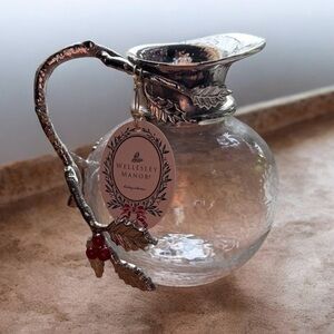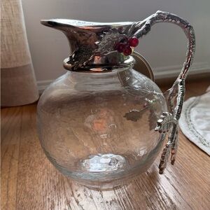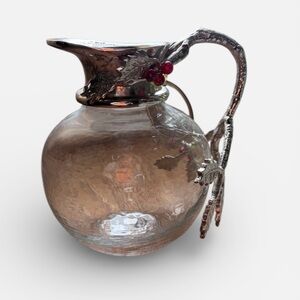 Beautiful glass pitcher with intricate silver handle. Perfect for serving or display.