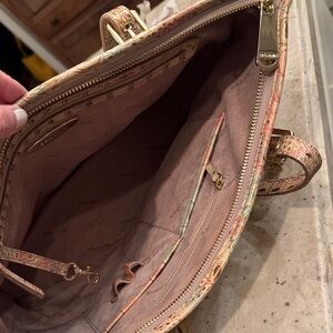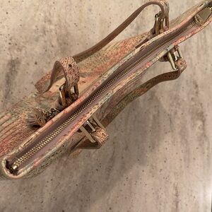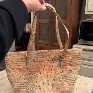 Elegant tote with a crocodile pattern. Features cream, tan, and pink hues. Perfect for any occasion. From a smoke free estate. Slight scuffs on footing on bottom.
