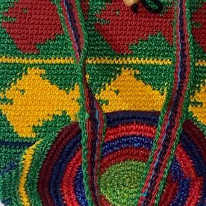 This handcrafted women's shoulder bag features a vibrant mix of red, green, yellow, and blue. Perfect for adding a unique touch to your style.