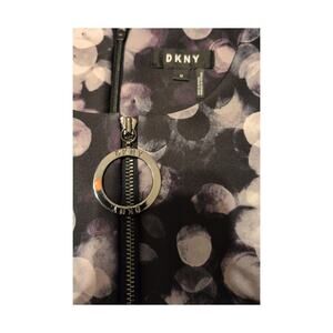 DKNY sleeveless fit-and-flare dress featuring a bold purple and black floral print. Designed with a flattering fit-and-flare silhouette and a classic crew or V-neckline. Crafted from a comfortable stretch blend, often referred to as scuba crepe or scuba knit, giving the dress structure while remaining easy to wear. Finished with a hidden zipper closure for a clean look.