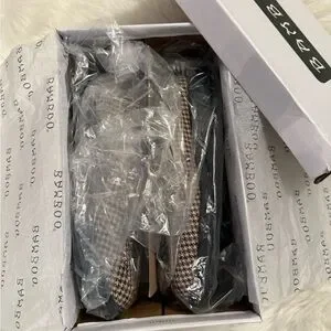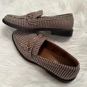 Beautiful houndstooth pattern of brown/black/cream, adorned with gold “horse bit” hardware. Comfortable slip-on design. Ideal for versatile wear & add class to your outfit! Size 8, true to size
