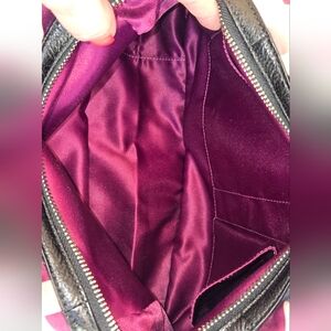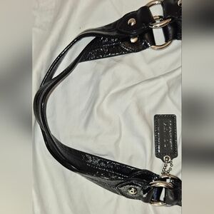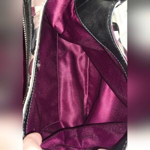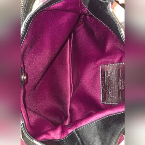 Gorgeous Coach shoulder bag with classic C pattern. Features sturdy black handles and rare purple interior. Bag has three compartments, two with zippers and the middle with a magnetic closure. I have a wristlet that would go perfectly with this bag if you'd like to bundle and save.