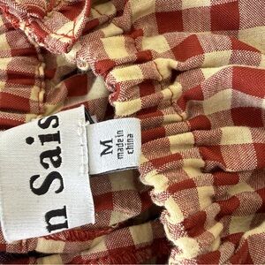 En Saison Gingham Ruffle Sleeve Top. Style name is Women's Juni Gingham Ruffled Short-Sleeve Blouse. Brown/rust gingham print. Size medium and true to size. Worn once and in great condition.